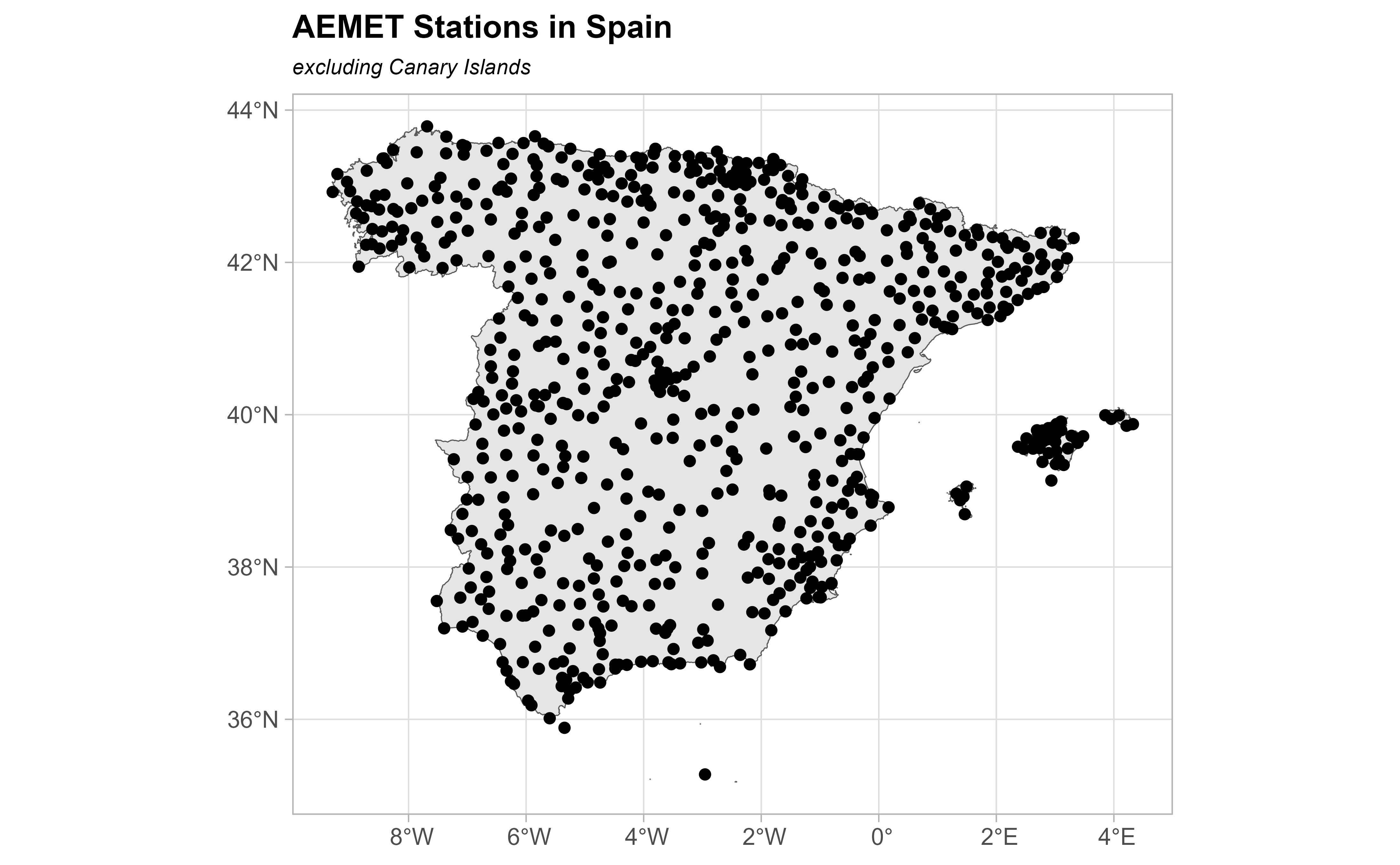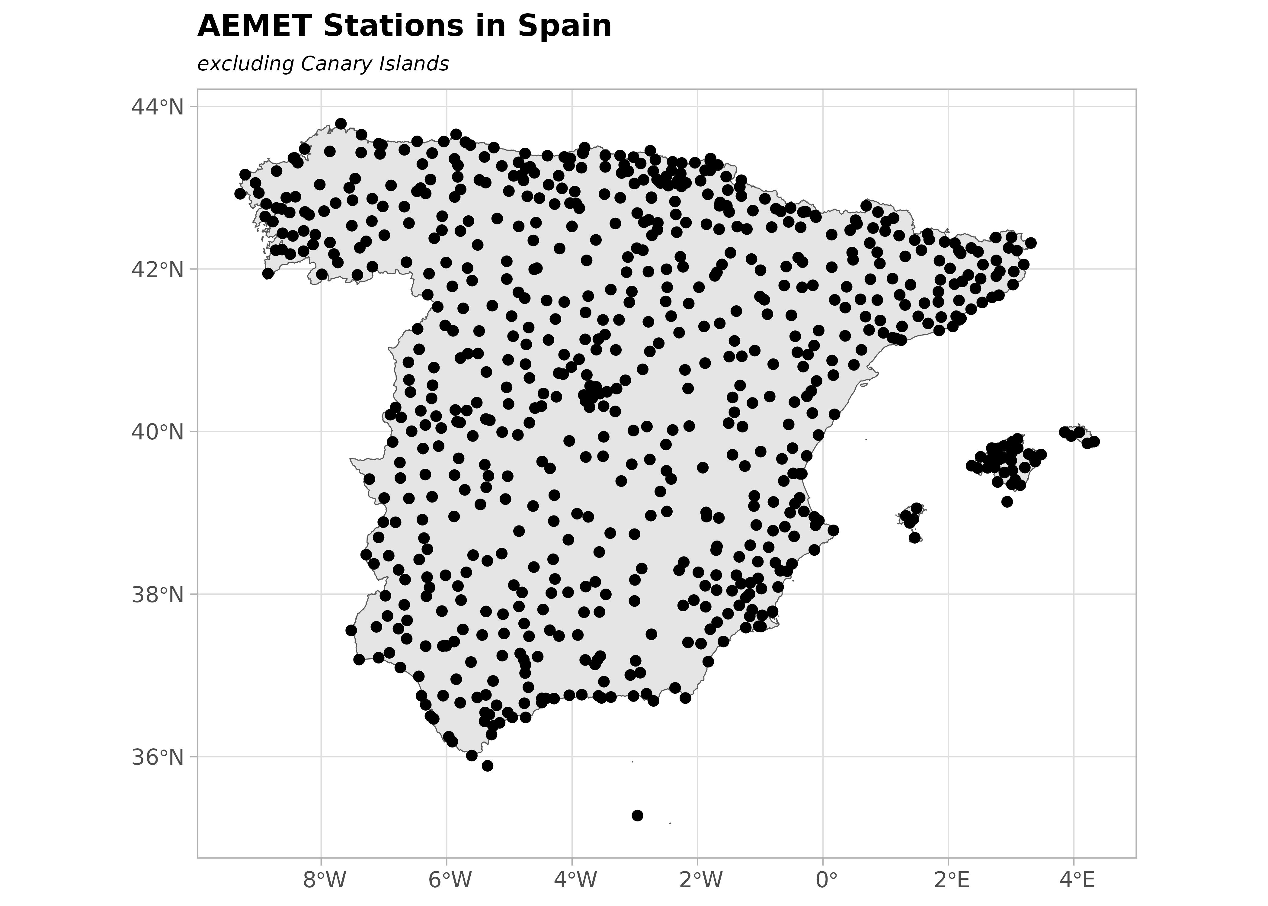 #> [26] "geometry"In this step, we select the variable of interest for each station. For simplicity, we would remove the Canary Islands in this exercise: