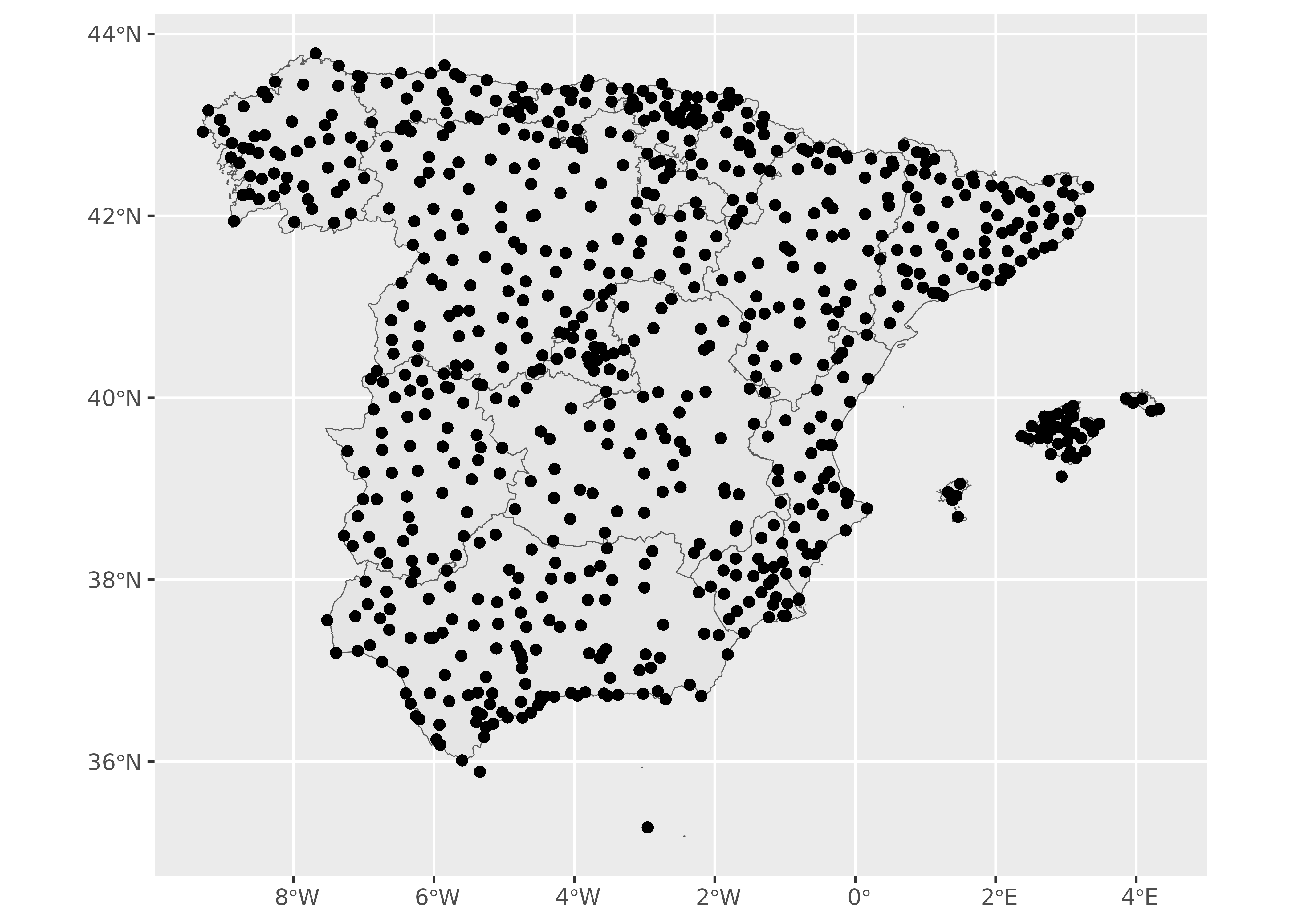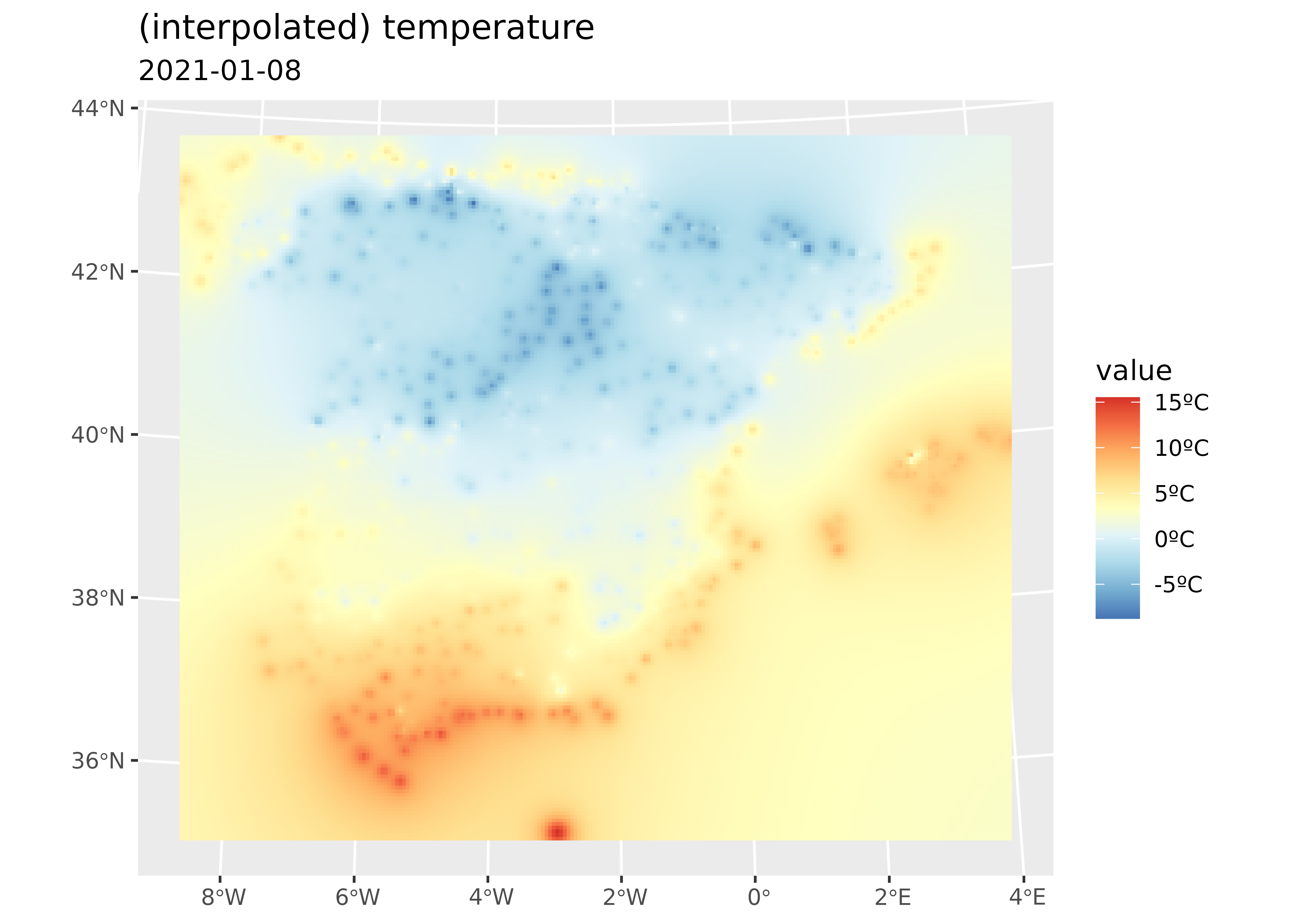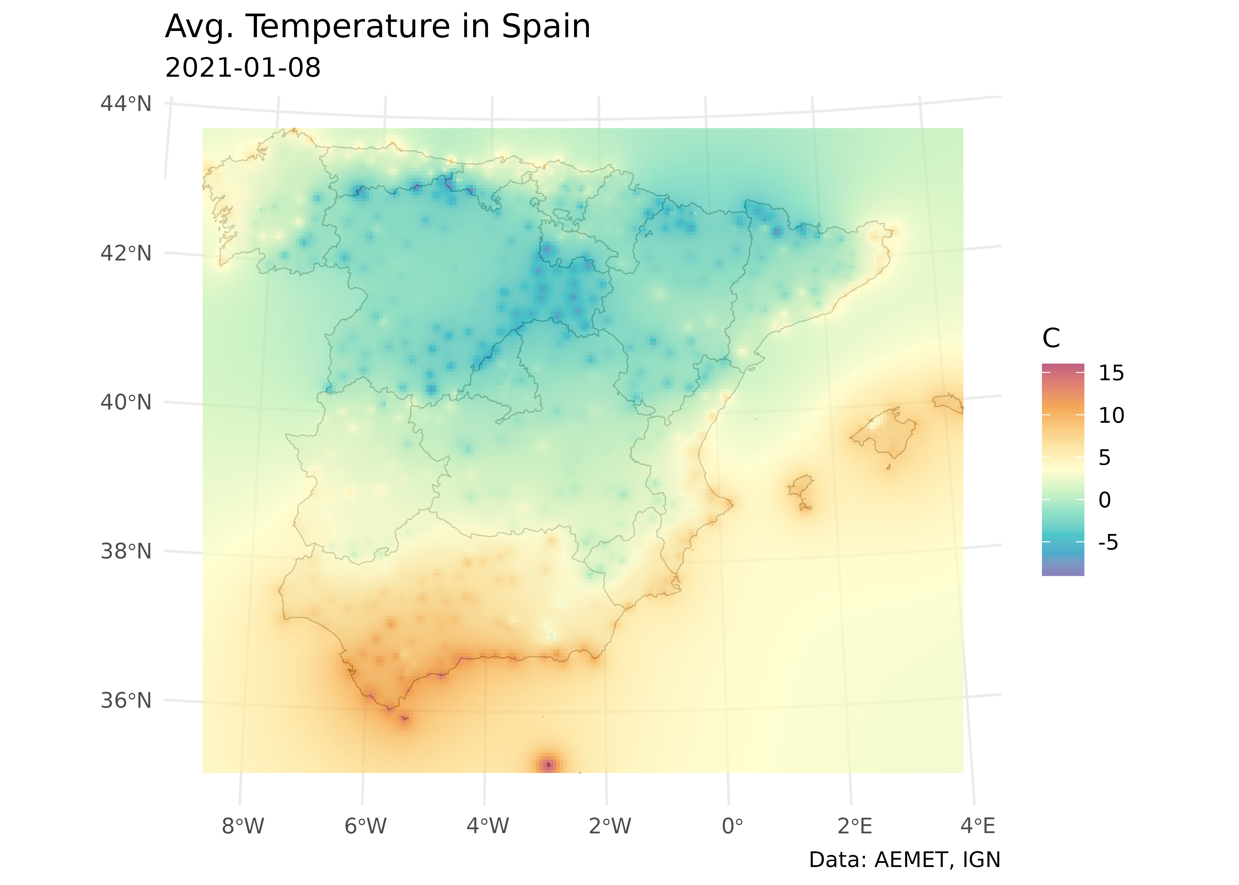 library(gifski) # we would create an animationclimaemet can retrieve data from the stations included on AEMET Open Data. However, in terms of spatial analysis and visualization, it can be useful to extend the data from points (stations) to the whole extent of Spain. On this article we would explain a method to interpolate the climatic data trough Spatial Interpolation, that is the process of using points with known values to estimate values at other unknown points.