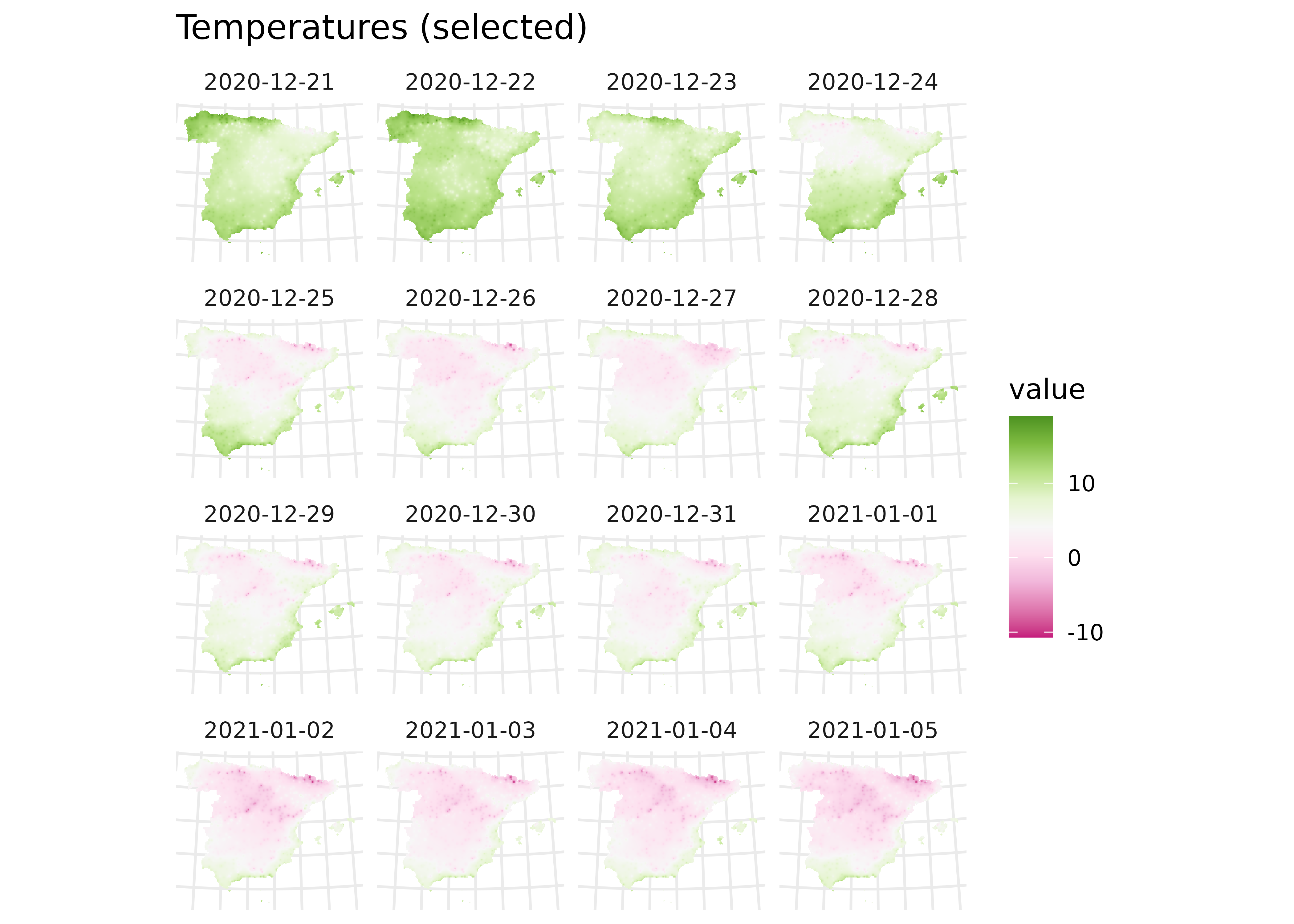 On this section, we would loop over the dates to create a single SpatRaster with several layers, each one holding the interpolation for a specific date. After that, we would create an animation to observe the evolution of temperature through the winter of 2020/21.